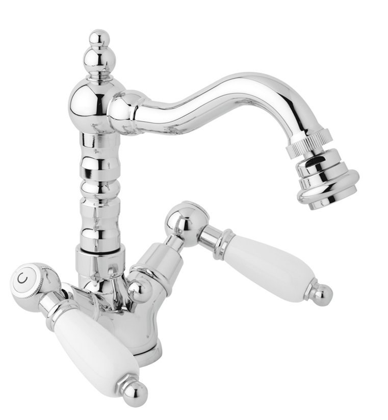 Двухвентильный смеситель с поворотным изливом и аэратором, монтируемый в одно отверстие. Имеет долгий срок эксплуатации за счет качественных деталей, неприхотлив в уходе. Станет прекрасным дополнением ванной комнаты в классическом или ретро стиле.